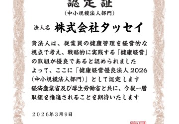 2026.03.31 「健康経営優良法人2026」に認定されました! 今年も、経済産業省と日本健康会議が共同で選定する「健康経営優良法人2026(中小規模法人部門)」に認定されました。 当社は今後も「健康経営」を重要な経営課題と捉え、従業員やその家族の健康増進により一層努めるとともに、事業を通じて地域や社会に貢献してまいります。 一覧に戻る prev next
